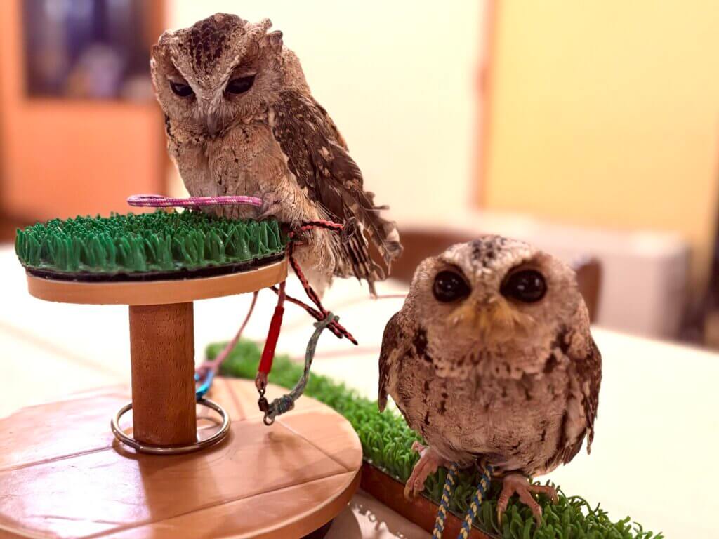 桃ちゃんはスンダオオコノハズク、ウリちゃんはカラードオオコノハズク、他にはインドオオコノハズクという種類があってみんな似たような姿かたちで見分けが付きません。名前の違いは、生息地によって?ブリードした国によって?色の濃淡?体格の微妙な違い?等諸説あるようですが良くわかりません。みんな可愛いことには変わりがないということです。